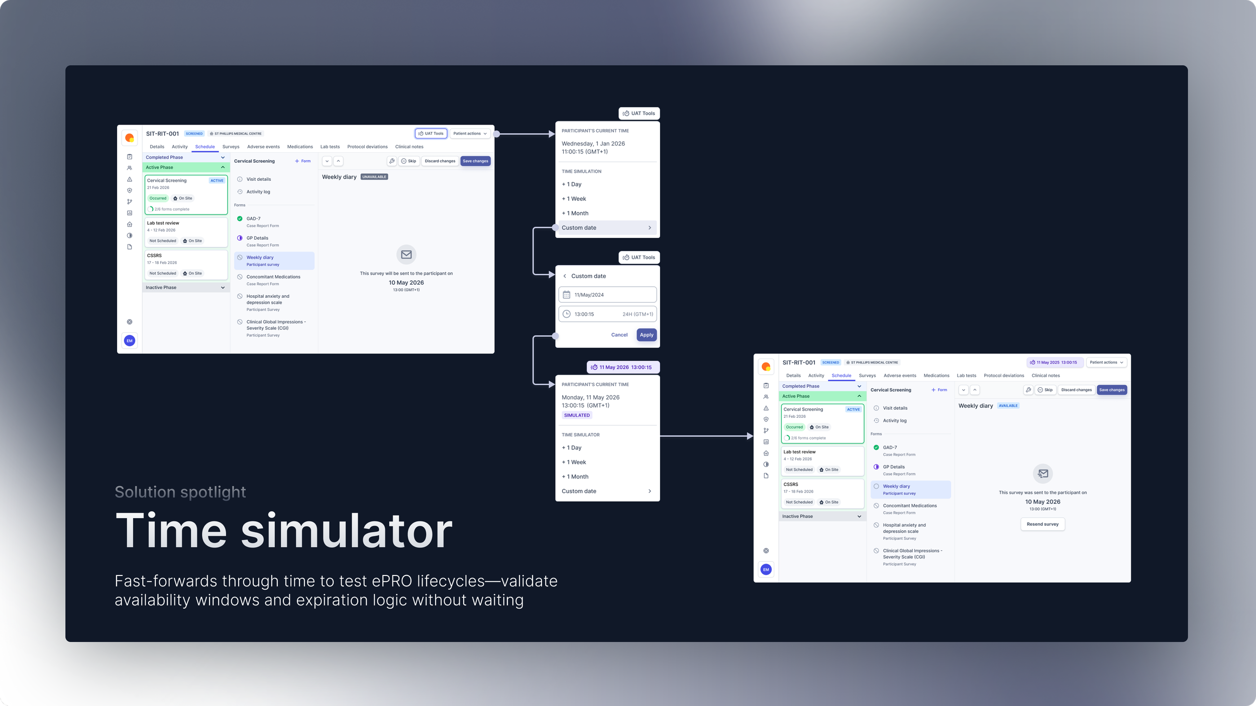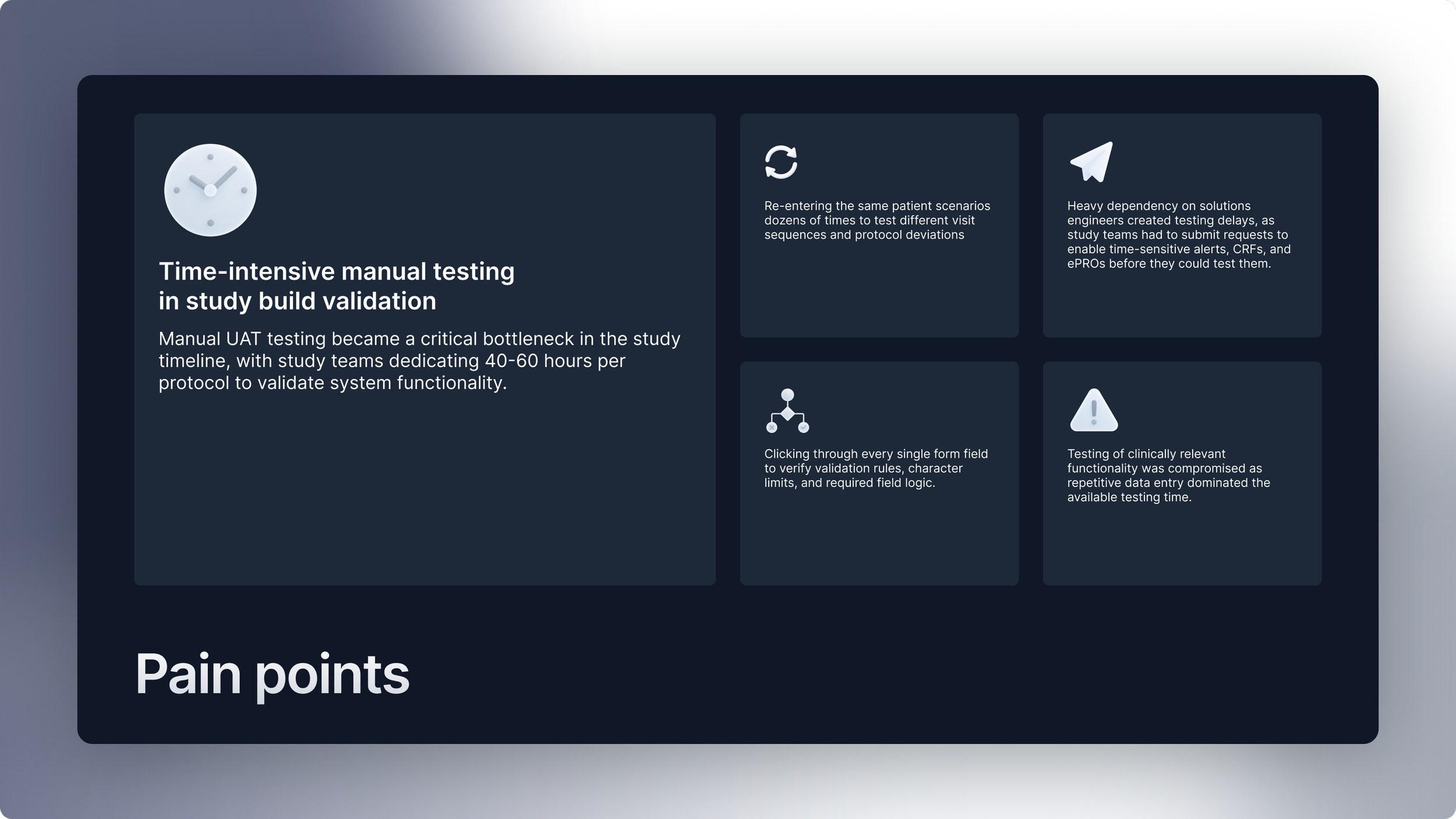 This project reimagines user acceptance testing for a clinical trial platform by designing an intelligent automation framework that transforms manual, time-intensive processes into streamlined workflows. Through user-centred design and automated testing, we eliminated resource bottlenecks, reduced cross-team dependencies, and create self-service capabilities that empower study teams to deliver trials faster without compromising quality.